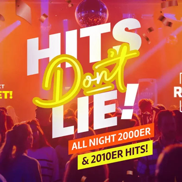 Zwei Jahrzehnte voller unvergesslicher Hits warten auf euch! Von Beyoncé, Shakira und Usher bis hin zu Dua Lipa, The Weeknd und Billie Eilish – bei Hits Don’t Lie gibt es die ikonischsten Songs der 2000er und die größten Hymnen der 2010er auf die Ohren. Schnappt euch eure Crew und tanzt durch eine Nacht voller Throwbacks und New-Age-Classics – hier treffen nostalgische Vibes auf frische Beats!