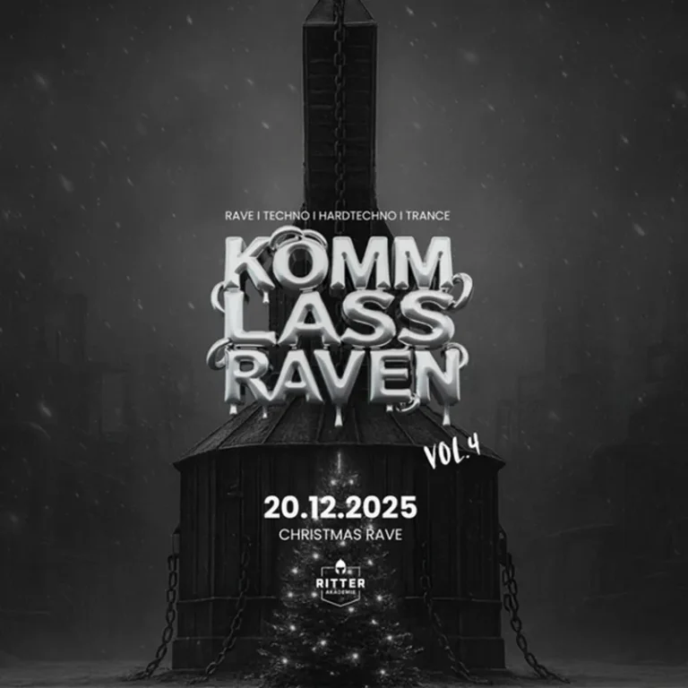 Die Christmas Rave Edition von „KOMM, LASS RAVEN“ taucht die Ritterakademie am 20. Dezember 2025 in eine festlich-finstere Parallelwelt aus hämmernden Bässen, flackernden Lichtern und kaltem Winternebel. Wenn Christmas auf Techno trifft, entsteht glitzernde Dunkelheit, die wie ein strobo-getränkter Schneesturm durch den Raum jagt – ein Rave, der wärmer ist als jeder Kamin. Das 360°-Boiler-Room-Feeling gehört natürlich dazu: Schweiß statt Schneeflocken, Bass statt Glocken. VOL. IV wird größer, wilder und elektrisierender als alles zuvor.